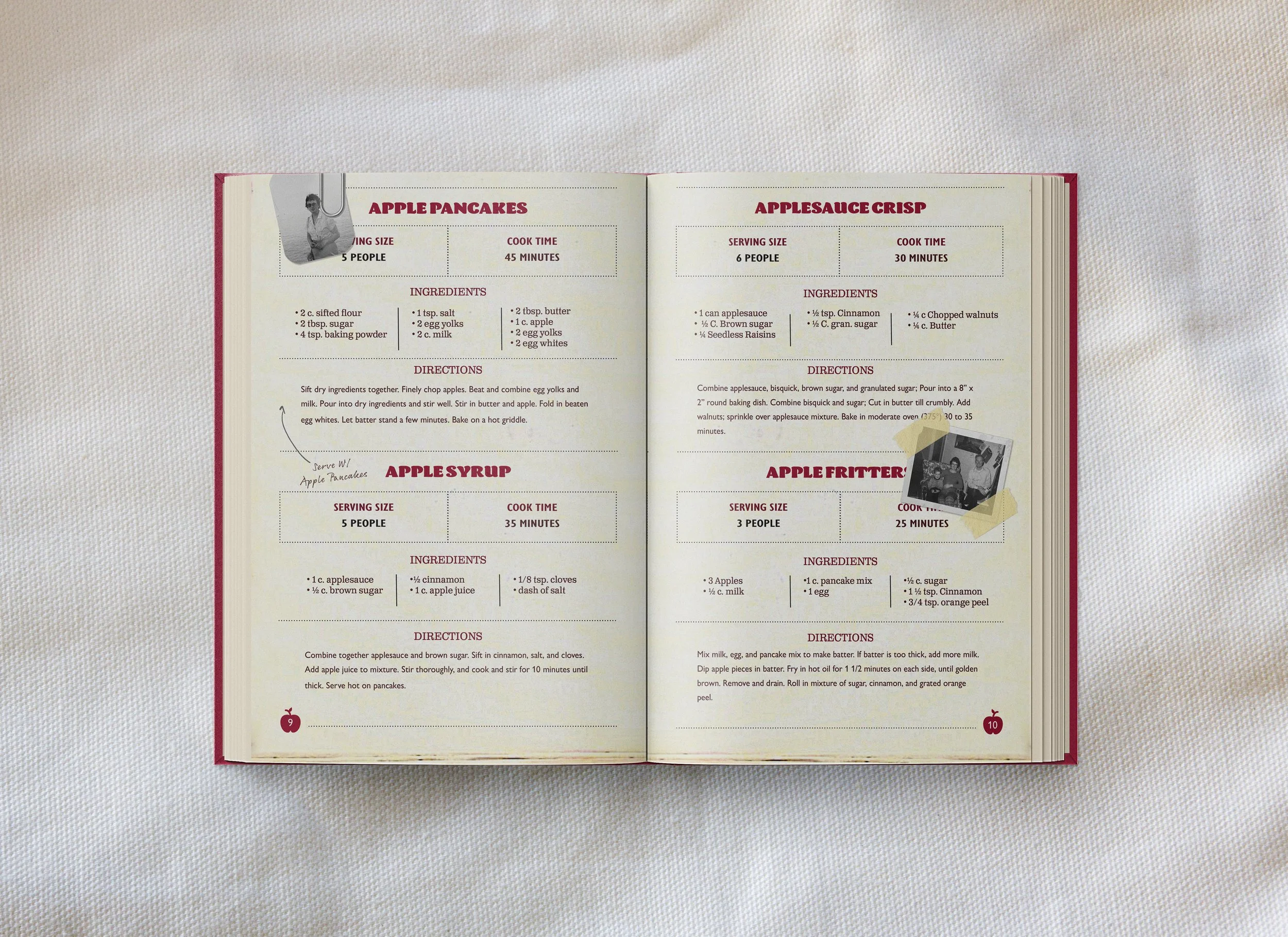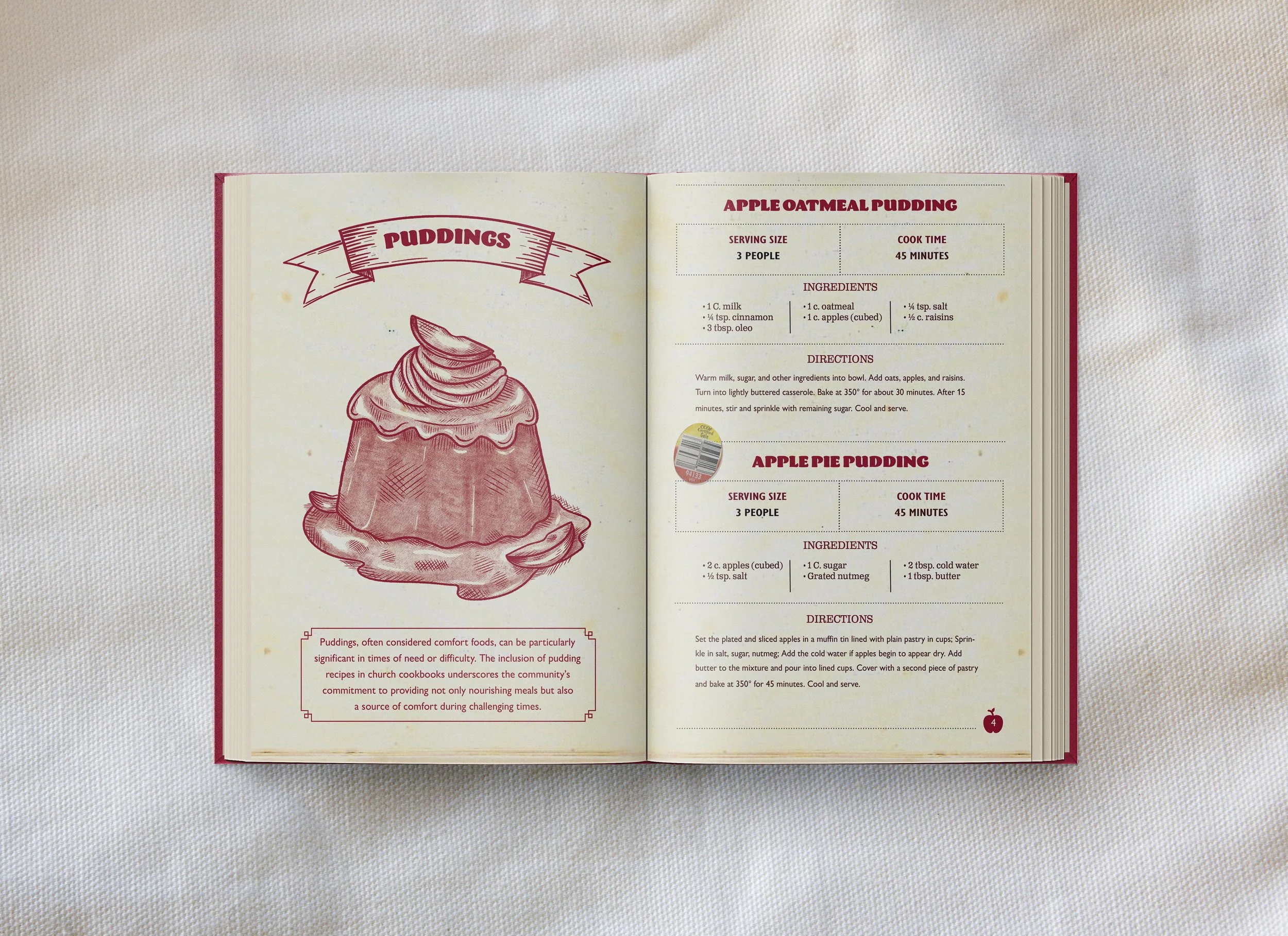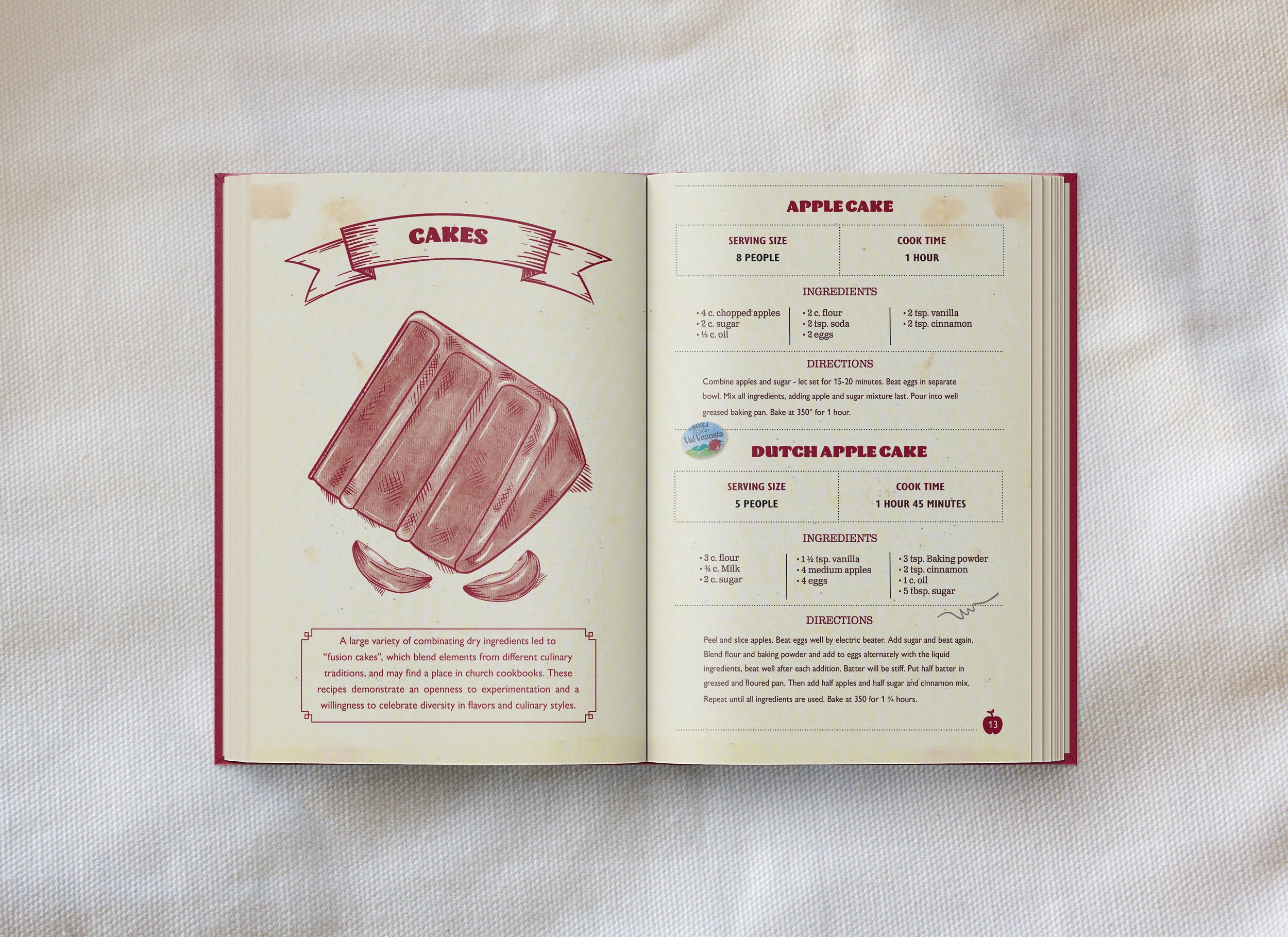 I chose to redesign an old church recipe book based around cooking with apples. I reformatted the original flip-book booklet style, and tightened up the recipes in each section of the original, into a classic book spread format by use of text, formatting, as well as some use of illustration. Overall, the book includes a front cover, back cover, and spine, as well as designed end pages, a title page, 7 sections of recipes, as well as info spreads that takes a deeper dive into both apples and their uses in dishes during the time, as well as a note about church cook books and their history.