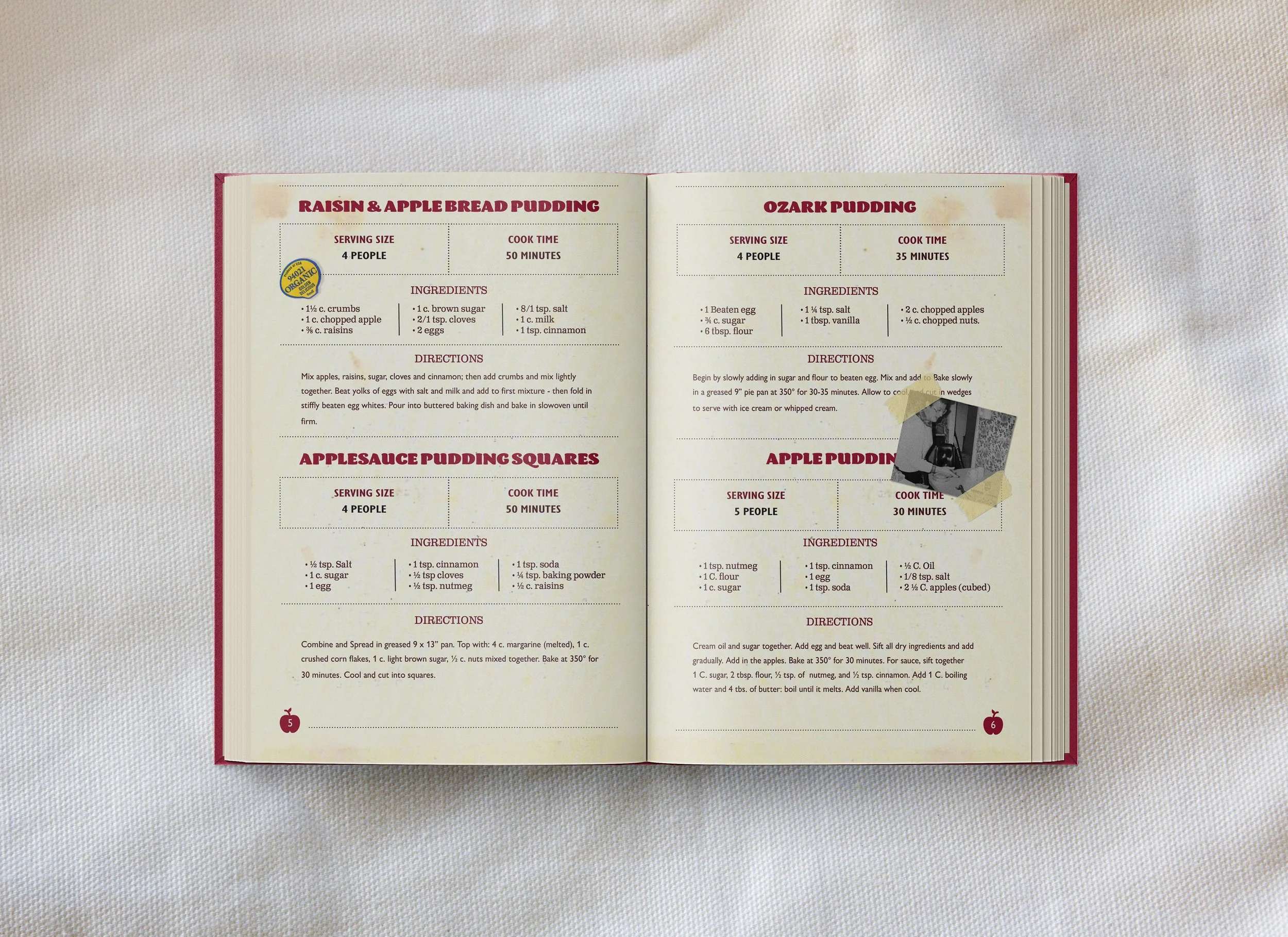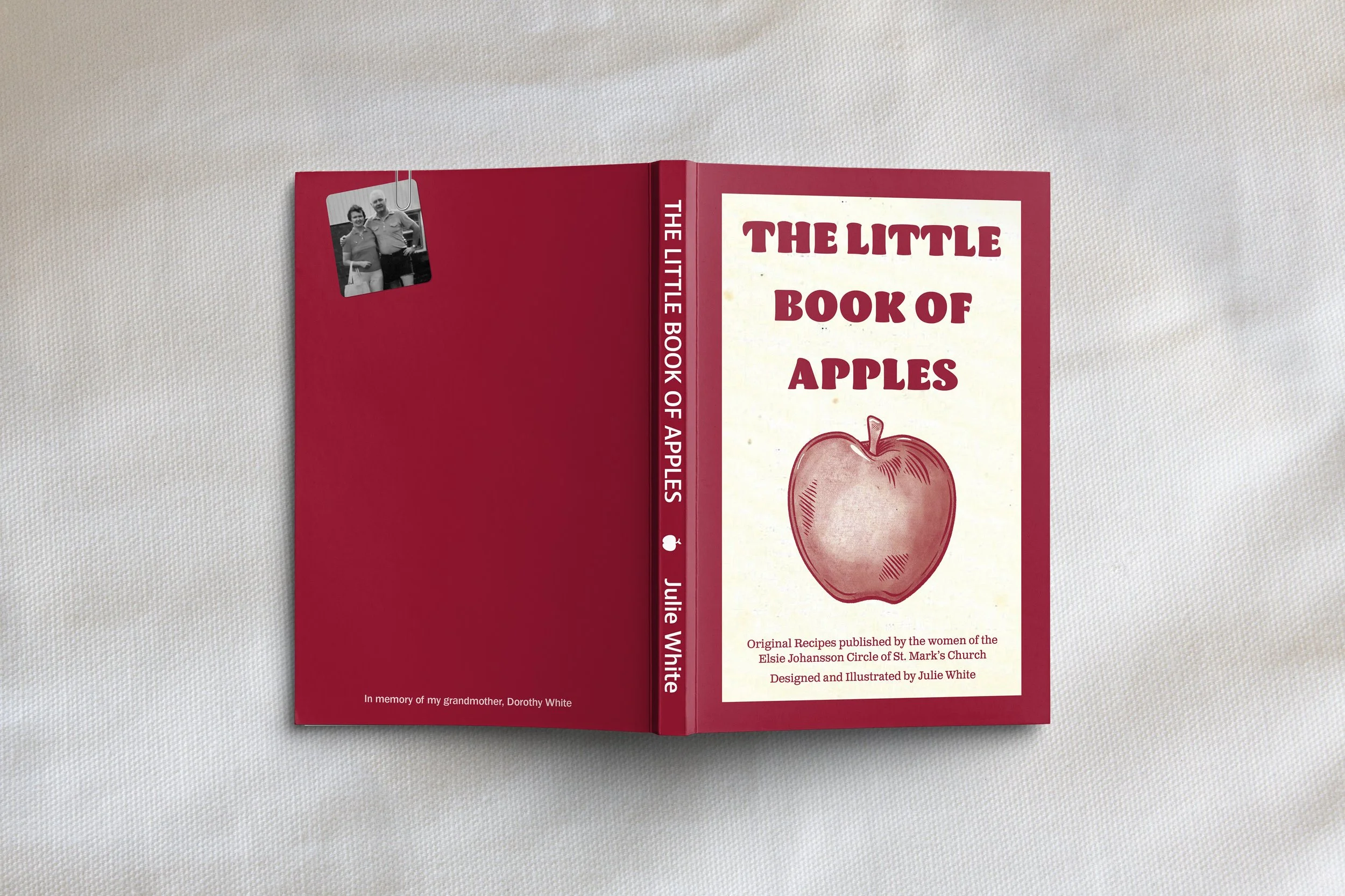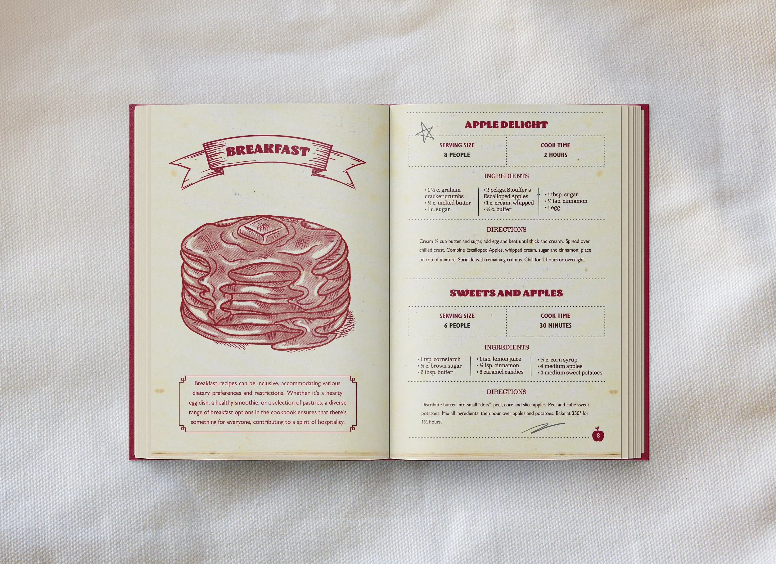 I chose to redesign an old church recipe book based around cooking with apples. I reformatted the original flip-book booklet style, and tightened up the recipes in each section of the original, into a classic book spread format by use of text, formatting, as well as some use of illustration. Overall, the book includes a front cover, back cover, and spine, as well as designed end pages, a title page, 7 sections of recipes, as well as info spreads that takes a deeper dive into both apples and their uses in dishes during the time, as well as a note about church cook books and their history.